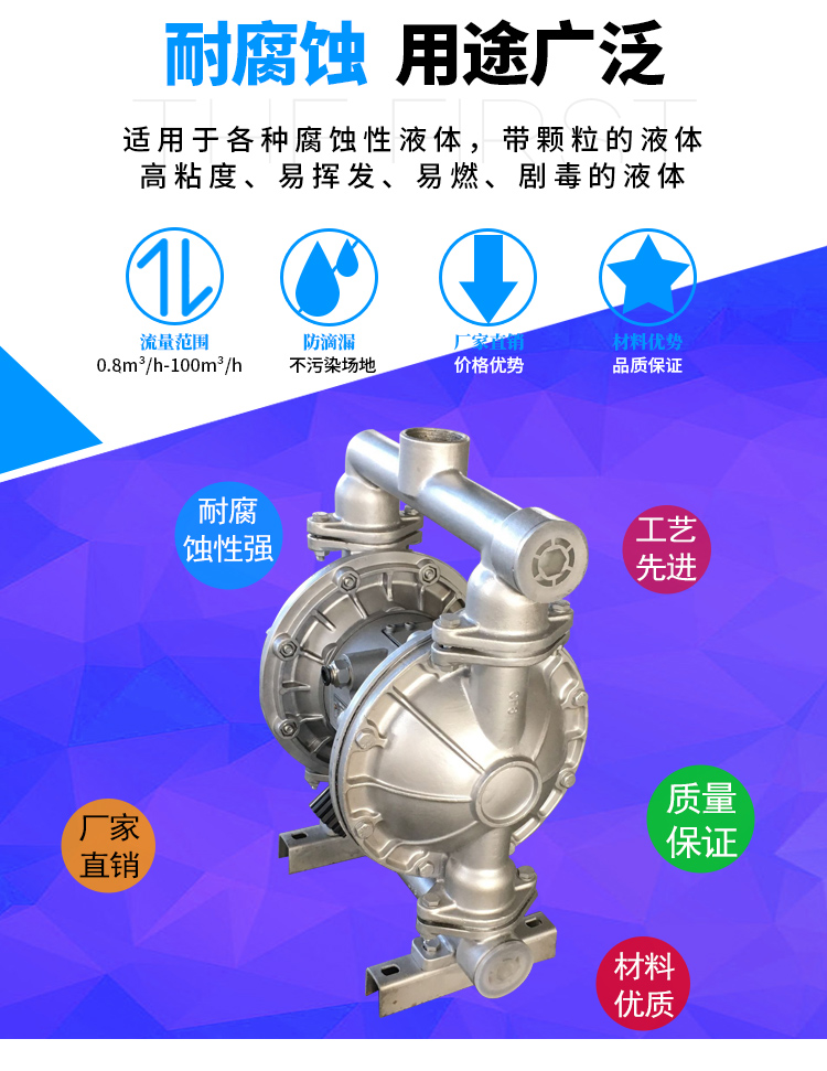 采用壓縮空氣為動力源,對于各種腐蝕性液體,帶顆粒的液體,高粘度、易揮發(fā)、易燃、劇毒的液體,均能予以抽光吸盡,尤以適合易燃易爆場。